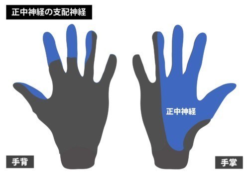 手首の手のひら側には正中神経という指の感覚を支配する神経が通っています。その神経が骨折で圧迫を受けると親指や人差し指がしびれることもあります。(図3)
