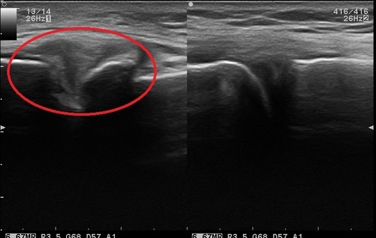 当院のエコー観察下にて軟骨の変性・関節変形を確認。