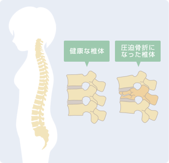脊椎圧迫骨折とは、脊椎(せぼね)の椎体が押しつぶされて骨折することを言います。骨粗鬆症などで骨が弱くなっている状態で尻もちをついた時や、くしゃみをした時など比較的軽い力が加わって起こります。そのため最近では「いつのまにか骨折」と言われるくらいです。